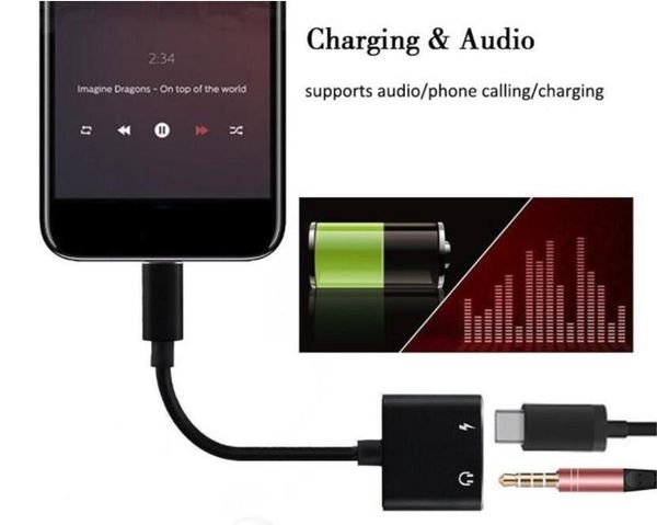2 In 1 Audio To Headphone Audio Charger Adapter Cable Type C 3 5mm Aux Earphone Charge Jack Adapter Connector For Iphone Samsung Huawei Phone Headset
