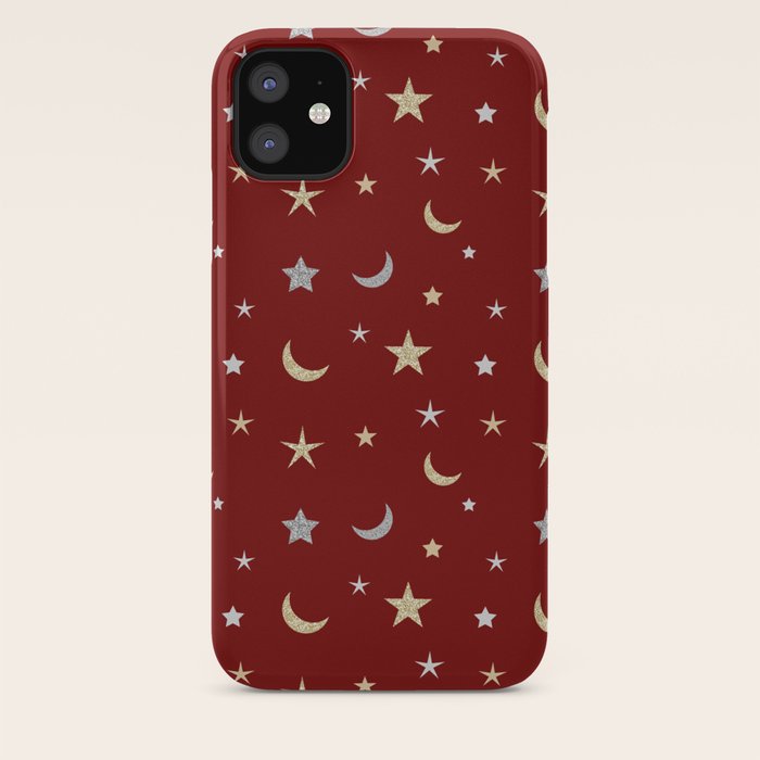 Gold And Silver Moon And Star Pattern On Red Background Iphone Case