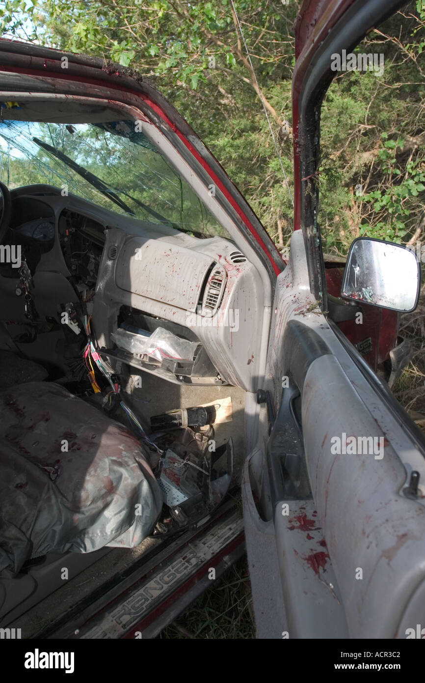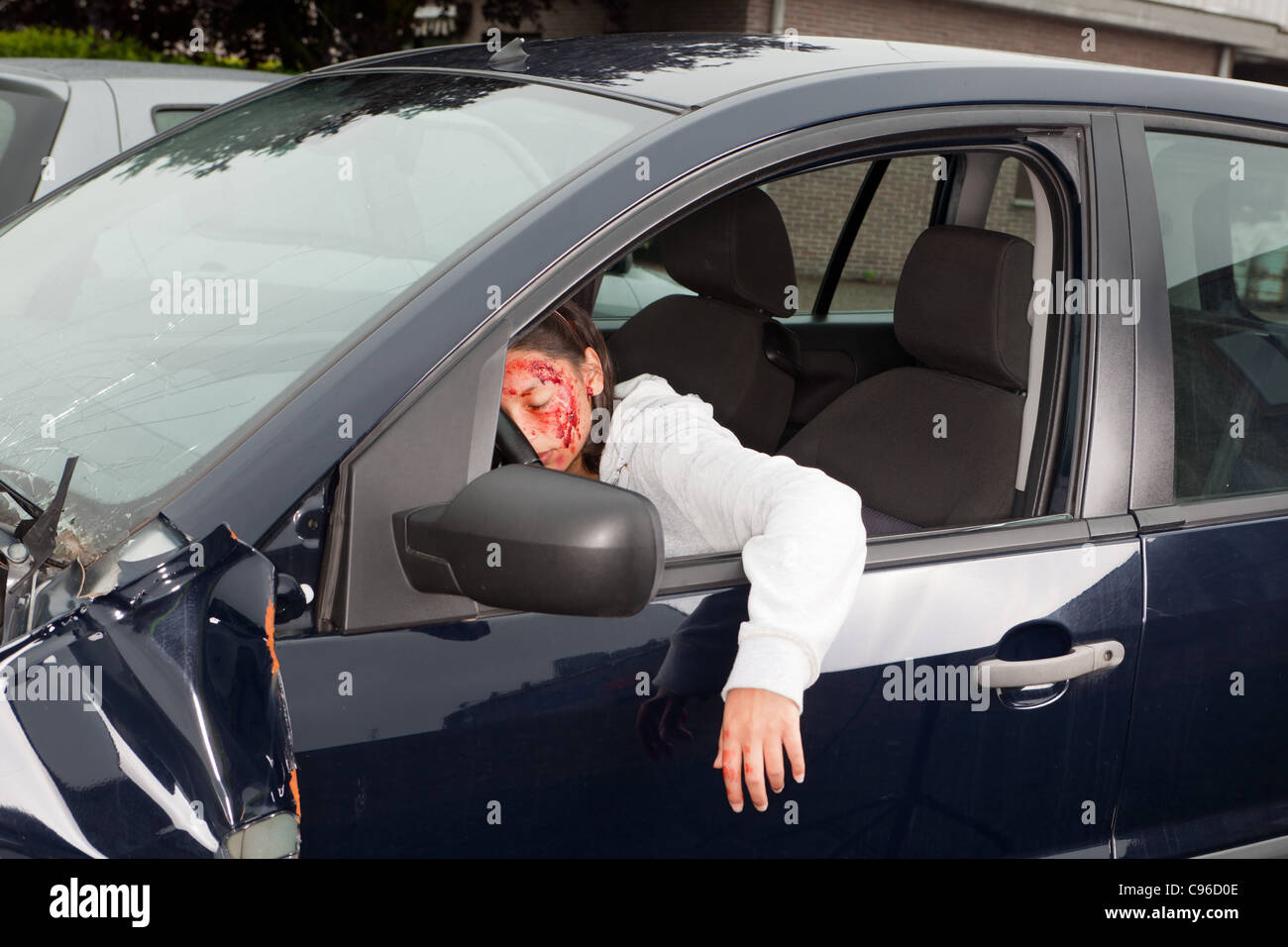 Blutende Frau Fahrer Bewusstlos Nach Einem Autounfall Stockfoto