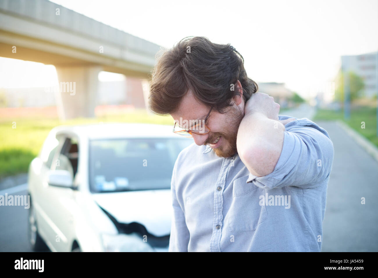 Der Mensch Schmerzen An Den Hals Nach Einem Autounfall Stockfoto